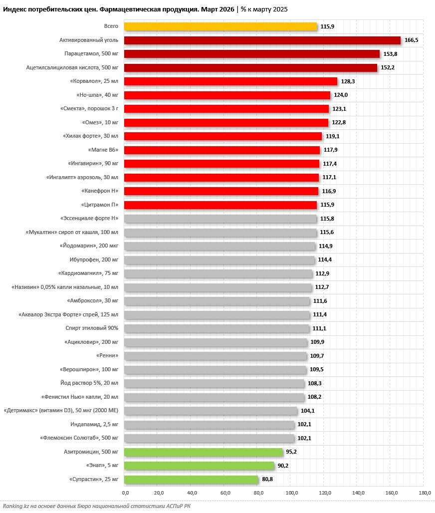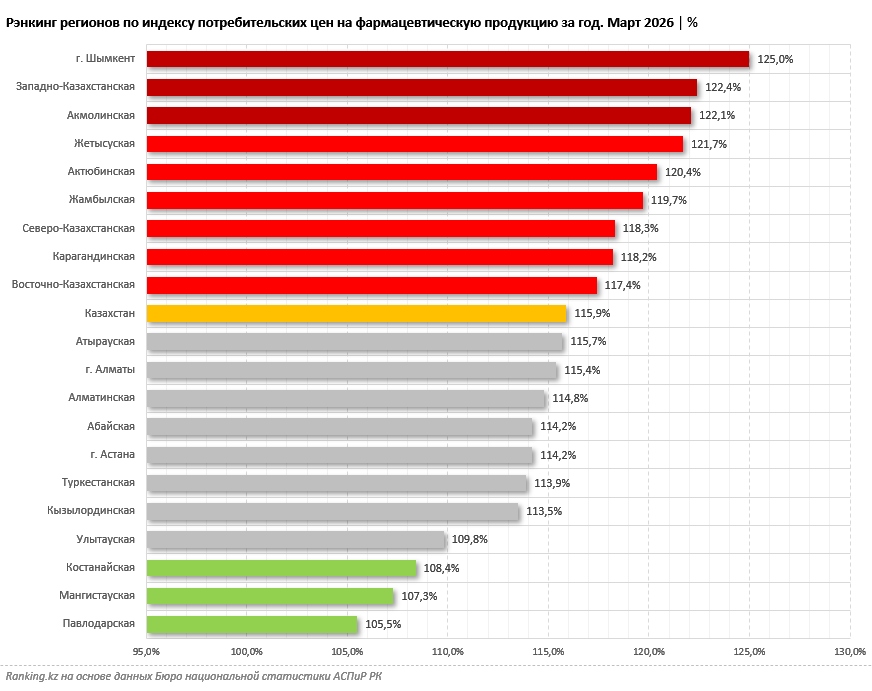 Наибольшее удорожание фармацевтической продукции в марте 2026-го было зафиксировано в Шымкенте: на 25% за год. Далее следуют Западно-Казахстанская (на 22,4%) и Акмолинская (на 22,1%) области.
