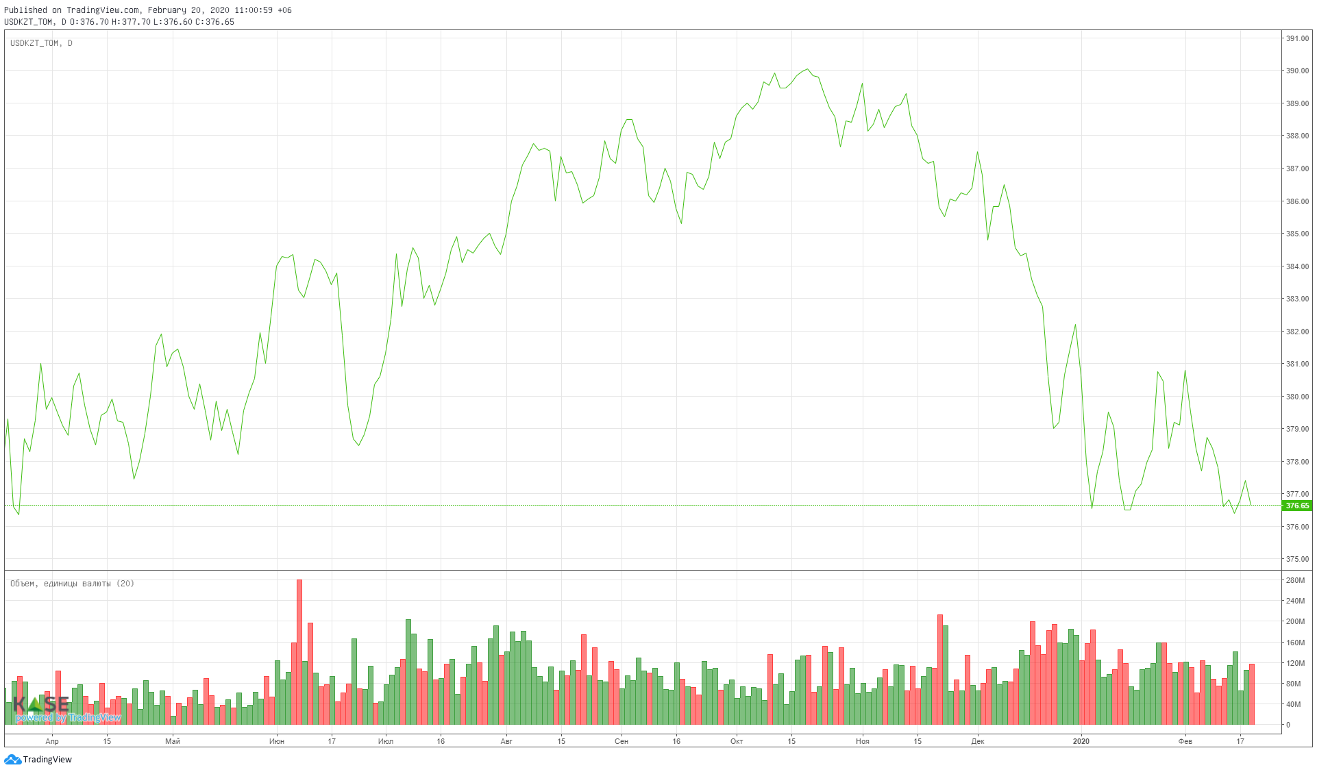На сегодняшней сессии пара USDKZT (11:00 ALA) торгуется на уровне 376,17 тенге за доллар, что на 90 тиынов ниже средневзвешенного курса закрытия предыдущей сессии.