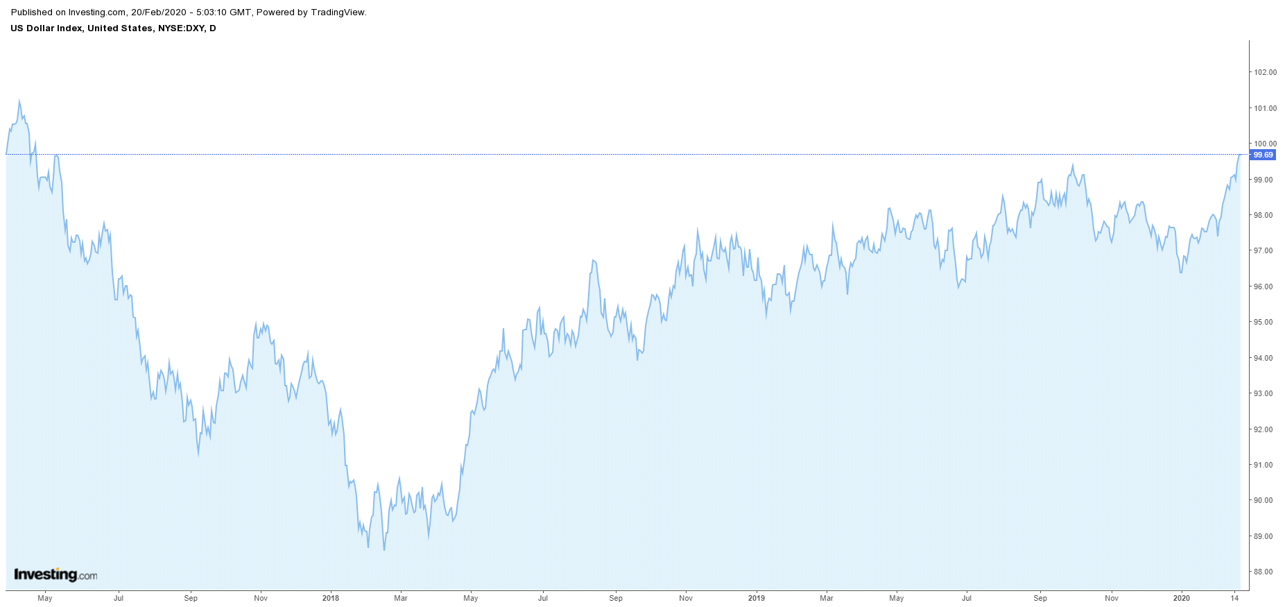 Вчера был опубликован протокол январского заседания комитета по открытым рынкам ФРС. Из документа следует, что члены комитета разошлись во вменениях относительно эффективности мягкой монетарной политики. По мнению ряда членов комитета, при некоторых обстоятельствах низкие процентные ставки могут способствовать поддержанию финансовой стабильности. Тогда как, другие отмечают, что поддержание низких процентных ставок может способствовать возникновению уязвимости финансовой системы. Таким образом прогнозировать дальнейшее направление изменения ДКП становтся все труднее. Вместе с тем, по оценке CMEGroup вероятность сохранения ставок на текущем уровне по итогам заседания 18 марта оценивается в 90,0%, тогда как дальнейшее смягчение ДКП вероятно произойдёт во второй половине 2020 года. Публикация протокола заседания ФРС не оказало значительно влияния на индекс доллара, но последующая публикация позитивных статданных по экономике привели к росту американской валюты. Индекс доллара США вырос на 0,26% до 99,7 пунктов и находится вблизи максимального за последние три года уровня. На стороне доллара сильные данные по рынку жилья. Так, опубликованные вчера данные Министерства торговли США показали, что жилищное строительство в январе сократилось на 3,6% в месячном выражении, что на много меньше, чем ожидалось рынком. Экономисты прогнозировали, что жилищное строительство сократится более чем на 30%. В то же время, количество разрешений на строительство выросло на 9,2% до 1,551 млн единиц в январе, что является максимальным уровнем с марта 2007 года. Рынок жилья США продолжает поддерживаться низкими ставками по ипотечным кредитам. Опубликованные позднее данные Министерства труда показали, что в январе рост цен производителей в США (индекс PPI) составил 0,5% по сравнению с предыдущим месяцем. Подъем индекса PPI относительно января прошлого года составил 2,1%. Позитивные статданные по экономике также привели к росту фондового рынка. Индустриальный индекс Dow Jones вчера поднялся на 0,59%, S&P 500 вырос на 0,47%, а высокотехнологичный Nasdaq набрал 0,92%.