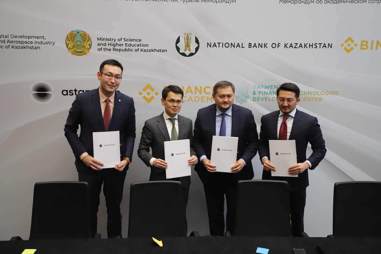 Сегодня Министр науки и высшего образования РК Саясат Нурбек, Министр цифрового развития и аэрокосмической промышленности РК Багдат Мусин и председатель правления АО «Центр развития платежных и финансовых технологий Национального Банка Республики Казахстан» Бинур Жаленов подписали меморандум с Binance Kazakhstan в лице Жаслана Мадиева об академическом сотрудничестве.