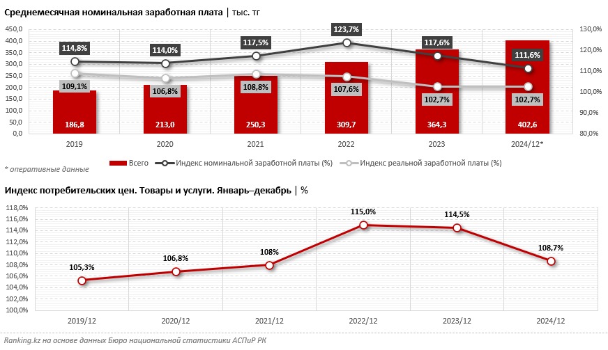 Рассмотрим, как менялась с годами главная статья доходов казахстанцев — зарплата. В абсолютном выражении средняя номинальная заработная плата за пять лет выросла в 2,2 раза, со 186,8 тыс. до 402,6 тыс. тг. Безусловно, ежегодный рост был умеренным. Максимальное увеличение наблюдалось в 2022-м (на 23,7%), минимальное — в прошлом году (всего на 11,6%).