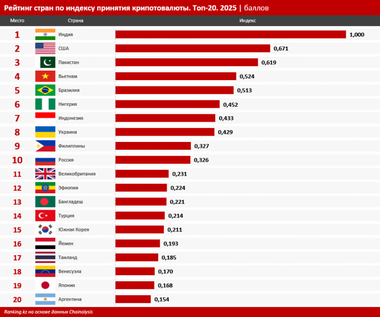 По данным Chainalysis, в 2025 году в топ-20 стран по индексу принятия криптовалюты вошли как развитые, так и развивающиеся экономики. Первые позиции заняли Индия и США — два крупнейших рынка, сочетающие большой объём транзакций с широкой вовлечённостью пользователей. На третьем и четвёртом местах расположились Пакистан и Вьетнам: в этих странах криптовалюта активно используется не только для инвестиций, но и для повседневных расчётов и трансграничных переводов.
