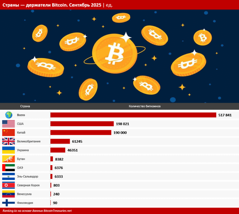 Лидером здесь выступают США, которые аккумулировали более 198 тыс. биткоинов. Эти активы во многом сформированы за счёт конфискаций и судебных решений, однако в марте американские власти официально объявили о создании Стратегического биткоин-резерва, что закрепило статус криптовалюты как части финансовой системы. Китай занимает второе место со 190 тыс. биткоинов, большая часть которых также оказалась в распоряжении государства через контролируемые структуры. Великобритания замыкает тройку лидеров с пакетом более 61,2 тыс. монет, демонстрируя готовность интегрировать цифровые активы в свой финансовый сектор.