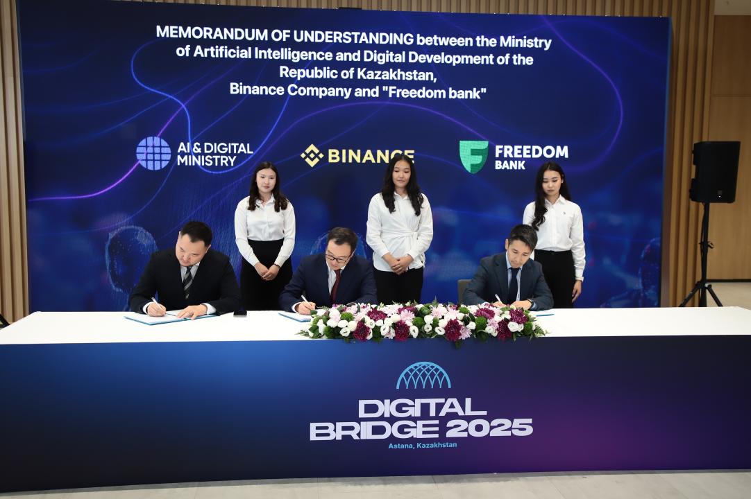 Министерство искусственного интеллекта и цифрового развития РК, компания «Binance» и АО «Фридом Банк Казахстан» подписали трехсторонний меморандум о сотрудничестве, направленный на развитие цифровых финансовых технологий и криптовалютных решений в Казахстане, передает DKNews.kz.