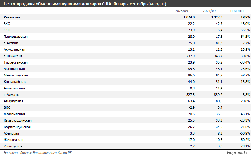 Положительные нетто-продажи обменными пунктами долларов США за январь–сентябрь текущего года наблюдались в 18 из 20 регионов РК. Наибольшие объёмы «чистых» продаж пришлись на Алматы и Шымкент: 327,5 млрд и 237,9 млрд тг соответственно. При этом по сравнению с январём–сентябрём 2024-го объём продаж долларов США в Алматы сократился на 8,8%, а в Шымкенте — сразу на 30,8%.