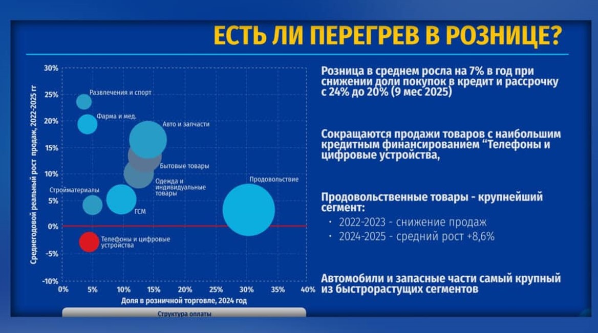 «Сокращаются продажи товаров с наибольшим кредитным финансированием – телефонов и цифровых устройств, где сосредоточено более трети всех потребкредитов и рассрочек. Они снижаются с 2022 года. Самый крупный и быстрорастущий сегмент – автомобили и запчасти. По росту автокредитования розница перегревается» Александр Дауранов
