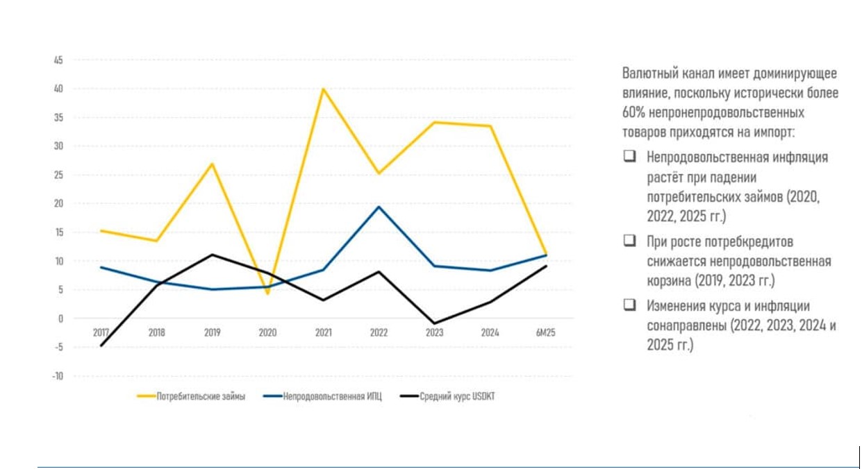 «Если посмотреть на статистику, видно, что в 2019-м и 2023-м годах был рост потребительских займов, а инфляция в непродовольственном сегменте замедлялась. Если сравнить графики среднего курса доллара к тенге и индекса цен на непродовольственные товары, то между ними прямая зависимость. Большинство этих товаров импортные, и в период ослабления тенге (22–24-е годы) рост цен почти полностью зависел от валютного канала» Елена Бахмутова