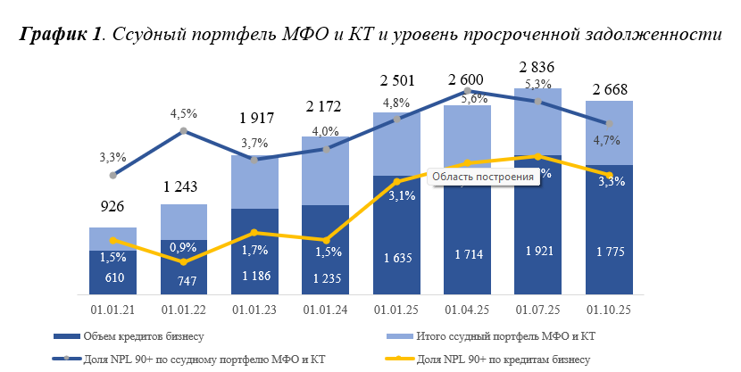в ссудном портфеле МФО и КТ остается на низком уровне. При увеличении NPL 90+ по всему ссудному портфелю с 2021 года на 1,4 п.п. на 01.10.2025г. уровень NPL 90+ составил 4,7%, в то время как NPL 90+ по микрокредитам субъектам предпринимательства увеличился на 1,7 п.п. и составил 2,9%.
