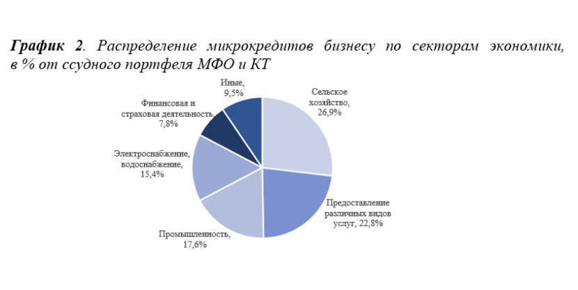 Так, наибольшая доля выданных микрокредитов приходится на отрасли сельского хозяйства (26,9%), предоставление услуг (22,8%), промышленность (17,6%), электроснабжение и водоснабжение (15,4%), финансовая и страховая деятельность (7,8%).