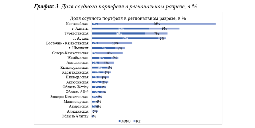 Основной объем микрокредитования бизнеса со стороны МФО приходится на г. Астана (20%), г. Алматы (18%), Туркестанскую область (16%), г. Шымкент (7%) и Жамбылскую область (6%).