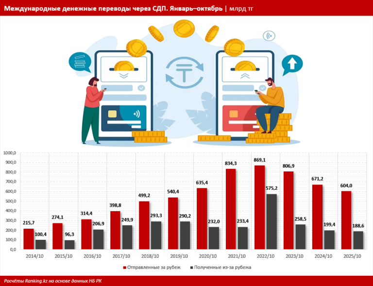 Так, за январь–октябрь 2025 года объём отправленных за рубеж через СДП средств составил 604 млрд тг — на 10% меньше, чем за аналогичный период 2024-го. Годом ранее их объём сократился на 16,8%.