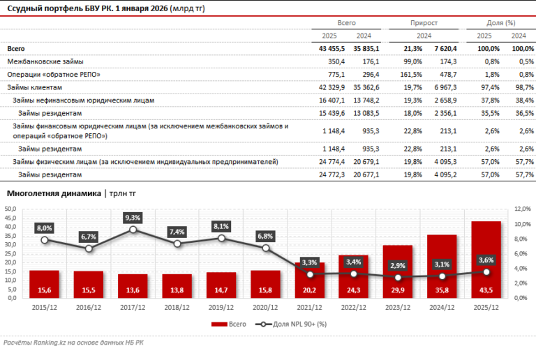 По итогам прошлого года ссудный портфель казахстанских банков второго уровня достиг 43,5 трлн тг, увеличившись на 21,3% по сравнению с 2024-м.