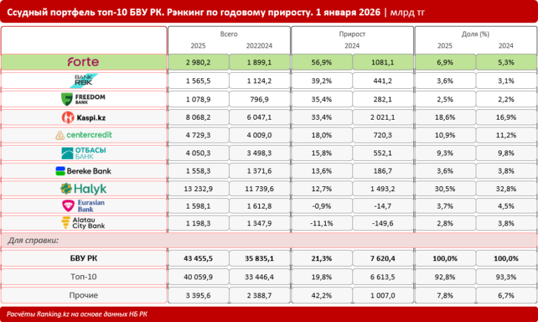 Лидером по годовому росту ссудного портфеля среди топовых банков-кредиторов с заметным отрывом стал ForteBank: сразу плюс 56,9% (или более 1 трлн тг), до почти 3 трлн тг. Фининститут отличается равновесной консервативной моделью кредитования, традиционно предлагает как розничные, так и бизнес-продукты и нацелен на системную кредитную поддержку реального сектора экономики. Так, например, по итогам третьего квартала 2025 года, согласно консолидированной финансовой отчётности банка, объём кредитов, выданных клиентам ForteBank, составил 2,8 трлн тг, из которых на розничный бизнес пришлось 40,9%, на крупный бизнес — 32,9%, на малый и средний бизнес (МСБ) — 25,3%.