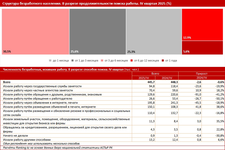Интересно также и то, как именно казахстанцы ищут работу. Больше всего безработных в четвёртом квартале прошлого года пытались найти подходящую вакансию по объявлениям в интернете: 195,8 тыс. человек. Более 150 тыс. человек сами размещали посты и объявления, ещё 110,4 тыс. человек публиковали или обновляли свои резюме на рекрутинговых площадках. Примечательно, что через государственные службы занятости вакансии искали реже: в такие организации обращались 94,8 тыс. из 445,7 тыс. безработных, то есть лишь каждый пятый.