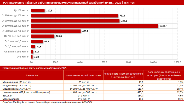 БНС регулярно публикует информацию о нескольких рассчитываемых видах зарплат. Мы распределили их по возрастанию и по численности наёмных работников. Результат анализа подчёркивает значительное расслоение в обществе: основная масса в 2025 году была сконцентрирована в нижнем сегменте или в середине «зарплатной лестницы», тогда как высокодоходные категории оставались малочисленными. Так, в категории получателей минимальной зарплаты (85 тыс. тг) оказались 43,8 тыс. казахстанцев — в 3,5 раза меньше, чем «миллионеров» (154,7 тыс. человек). Наибольшая доля работников (21,3%, или 711,8 тыс. человек) была сосредоточена в «модальном» диапазоне от 100 тыс. до 200 тыс. тг. Напомним: модальная (или наиболее часто встречающаяся) зарплата в прошлом году составляла 116,1 тыс. тг.
