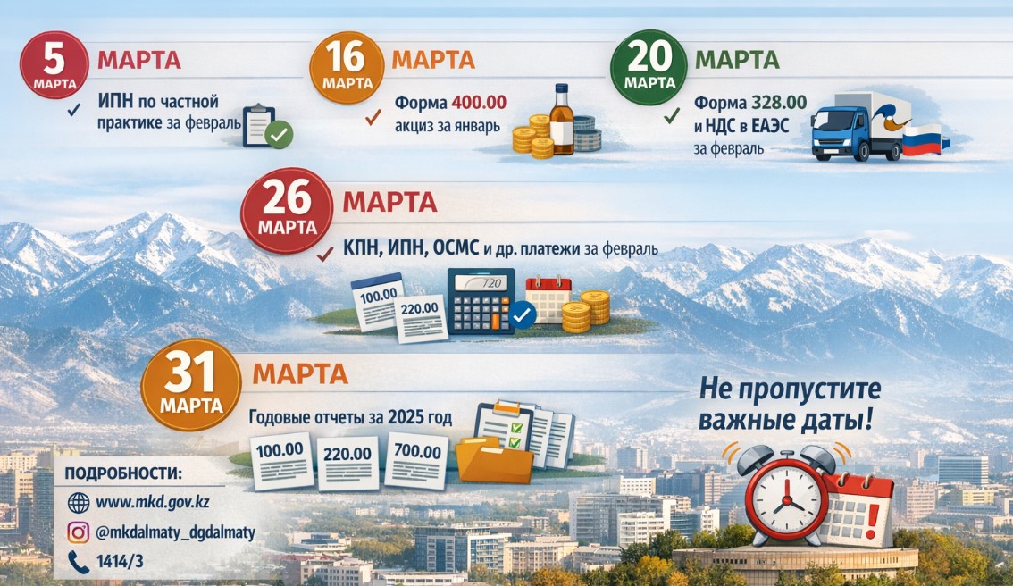 Как напоминает Департамент государственных доходов по городу Алматы, в марте 2026 года налогоплательщикам предстоит выполнить целый ряд обязательств по сдаче отчетности и уплате налогов.