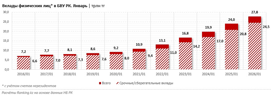 Вклады физических лиц в казахстанских банках по итогам первого месяца текущего года составили почти 28 трлн тг, увеличившись за год на 16%. Примечательно, что казахстанцы всё чаще отдают предпочтение сбережениям, а не просто текущим банковским счетам: так, срочные и сберегательные вклады достигли уже почти 25 трлн тг, увеличившись за год сразу на 18%. Их доля от всех вкладов населения превысила рекордные 88%.