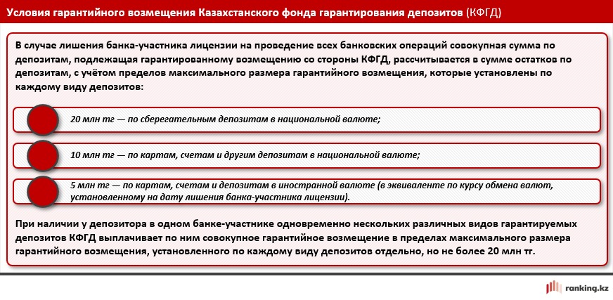 Вернёмся к типу вкладов, который мы уже упоминали. Здесь есть важный момент: среди рассматриваемых продуктов часть депозитов — сберегательные, другие — срочные. Это значит, что по первым Казахстанский фонд гарантирования депозитов (КФГД) гарантирует возмещение до 20 млн тг, а по вторым — только до 10 млн тг.