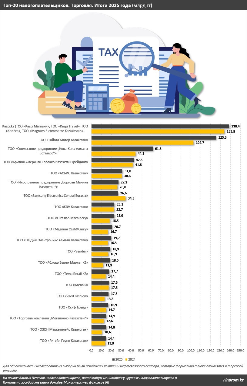 Полная информация о двадцатке крупнейших налогоплательщиках в отрасли торговли представлена в инфографике. Эти компании суммарно отчислили в казну страны в 2025 году более 690 млрд тг налогов.