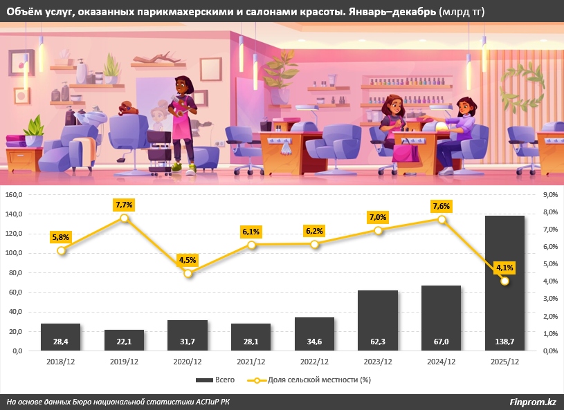 Рынок парикмахерских и салонов красоты в Казахстане последние годы демонстрирует резкий рост. Объём оказанных услуг в секторе увеличился с 28,4 млрд тг в 2018-м до 138,7 млрд тг в 2025 году (предварительные данные за январь–декабрь). При этом особенно заметный скачок произошёл в последние два года: если в 2022-м показатель составлял 34,6 млрд тг, то уже в 2023 году он увеличился до 62,3 млрд тг, а затем продолжил рост до 67 млрд тг в 2024-м.