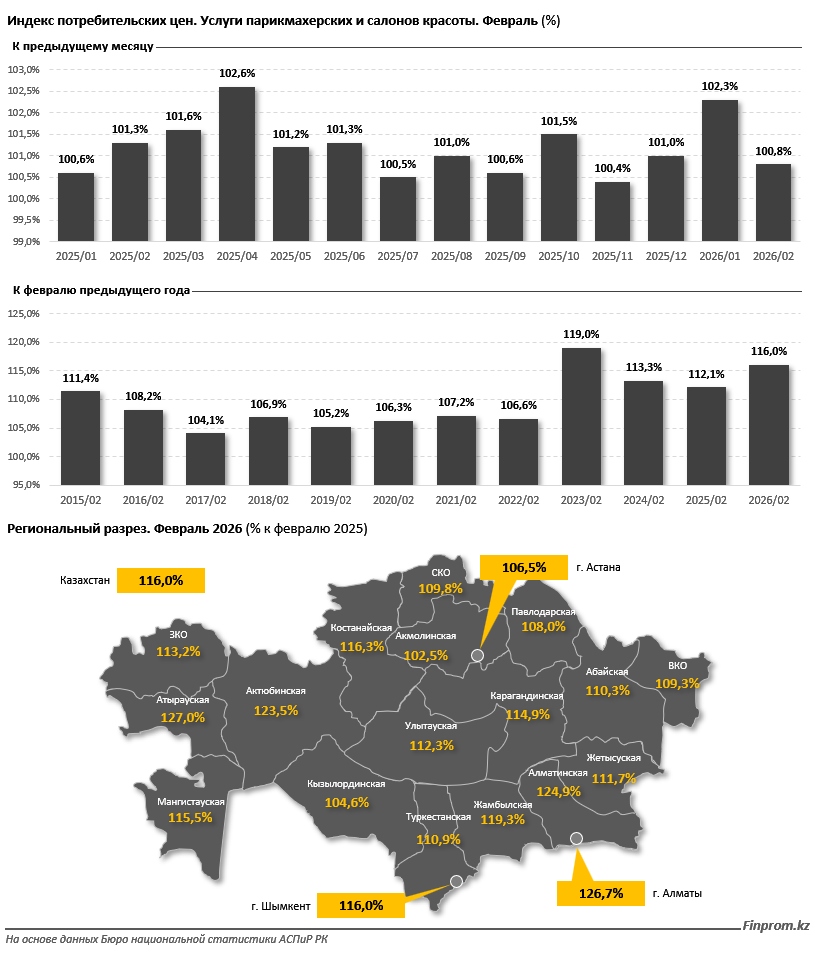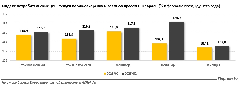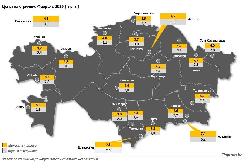 Средняя стоимость женской стрижки в казахстанских городах в феврале 2026 года составила 4,6 тыс. тг, мужской — 3,3 тыс. тг. Наибольшие цены на женскую стрижку были зафиксированы в Алматы (7,4 тыс. тг), Актау (5,3 тыс. тг) и Актобе (4,8 тыс. тг). Мужская стрижка дороже всего обходилась жителям Алматы (5,2 тыс. тг) и Караганды (4,1 тыс. тг). Самые низкие цены на стрижки наблюдались в Семее, Туркестане и Кызылорде.