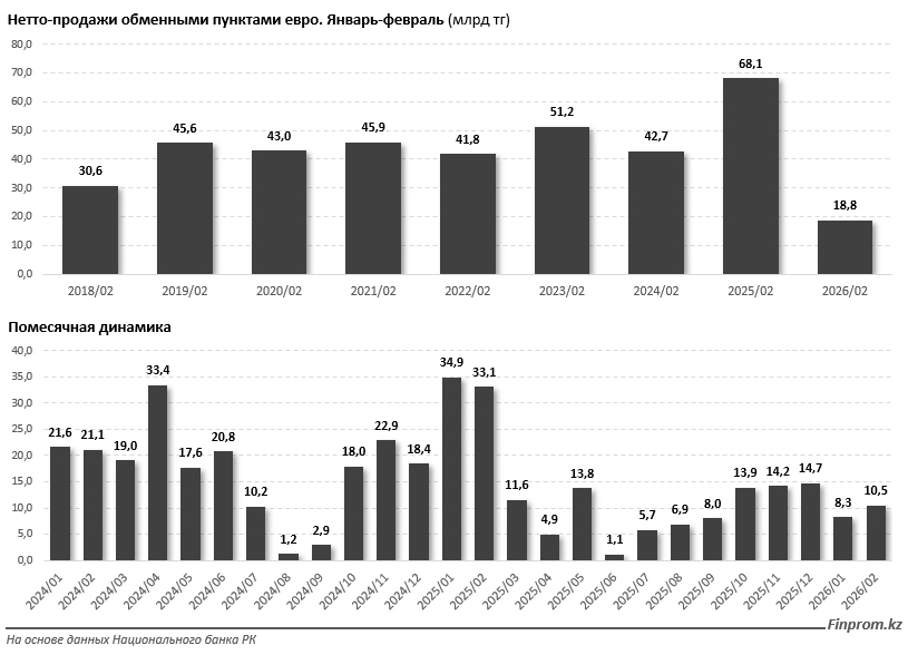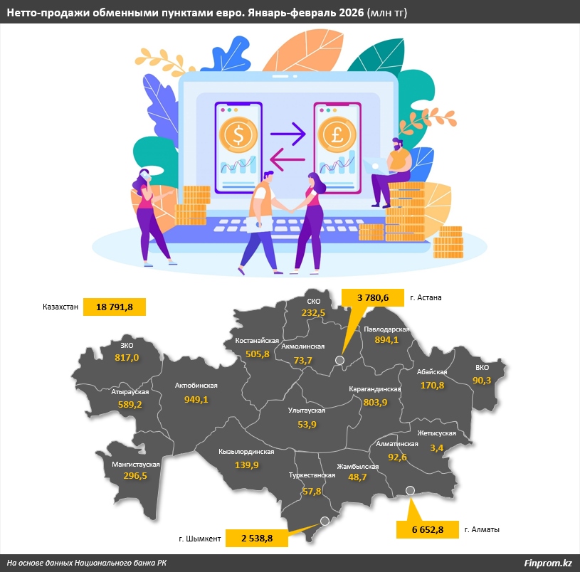 В региональном разрезе за январь-февраль 2026 года основной объём нетто-продаж евро традиционно пришёлся на мегаполисы. В Алматы показатель составил 6,7 млрд тг, против 17 млрд тг годом ранее. В Астане спрос сократился более чем в 6 раз, с 24,5 млрд до 3,8 млрд тг. В Шымкенте чистые продажи составили 2,5 млрд тг (годом ранее — 6 млрд тг).