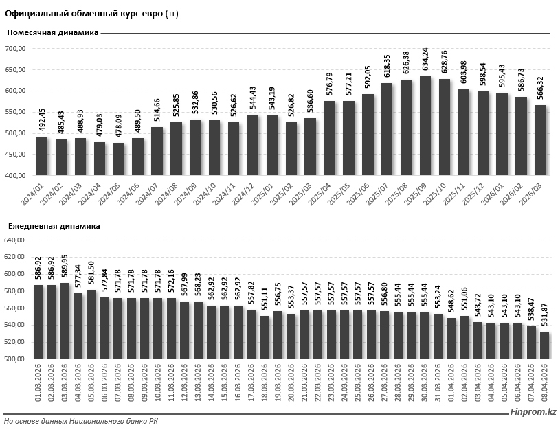 Ежедневная динамика подтверждает ослабление евро. Если 1 марта 2026-го курс составлял 586,9 тг, то к концу месяца он опустился на 5,7%, до 553,2 тг. В начале апреля тренд продолжился: на 8 апреля текущего года официальный курс евро составил 531,9 тг — на 3,1% меньше, чем на начало месяца.