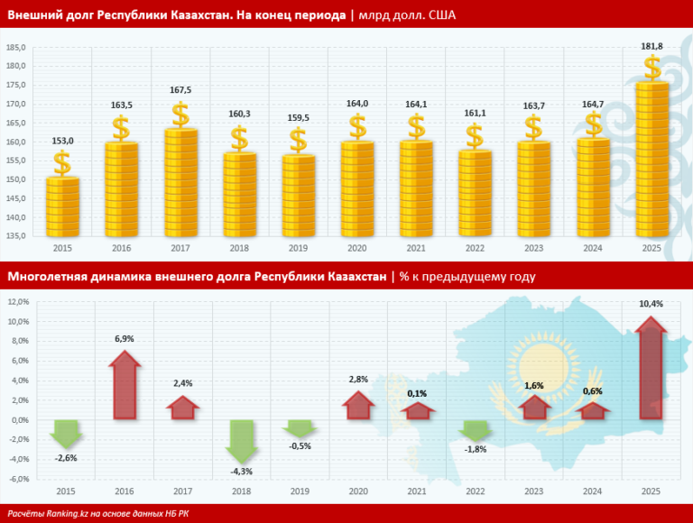 Согласно обновлённым данным Национального банка РК, к концу 2025 года внешний долг Казахстана достиг рекордного значения: почти 182 млрд долл. США.
