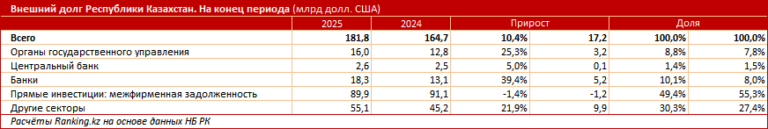 В целом структура внешнего долга Казахстана демонстрирует смешанную динамику: рост зафиксирован сразу в нескольких секторах, однако ключевое влияние, несмотря на уменьшение, по-прежнему сохраняет межфирменная задолженность. При этом ускорение увеличения долга банков и органов государственного управления может указывать на усиление внешнего заимствования в условиях текущей экономической конъюнктуры. В ближайшей перспективе важно будет оценить, насколько эти изменения повлияют на устойчивость долговой позиции страны.