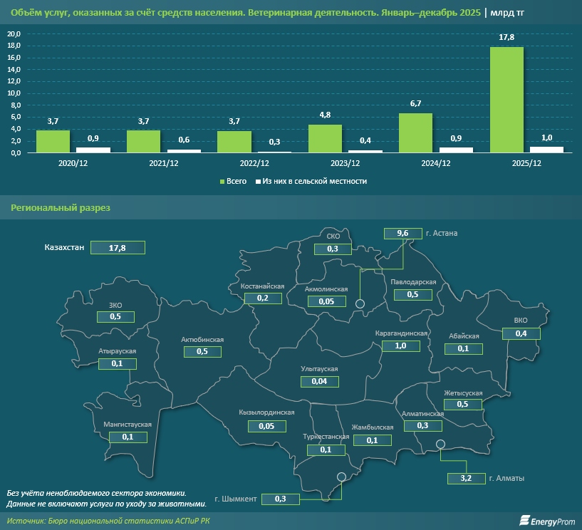 Предлагаем на основе статистических данных рассмотреть, как казахстанцы на самом деле заботятся о своих домашних животных и сколько денег тратят на это. Спойлер: намного больше, чем раньше. Согласно информации Бюро национальной статистики (БНС) АСПиР РК, за январь–декабрь прошлого года предприятиями, работающими в сфере ветеринарной деятельности, за счёт средств населения было оказано услуг на сумму более 17,8 млрд тг — в 2,7 раза больше, чем за аналогичный период 2024-го.