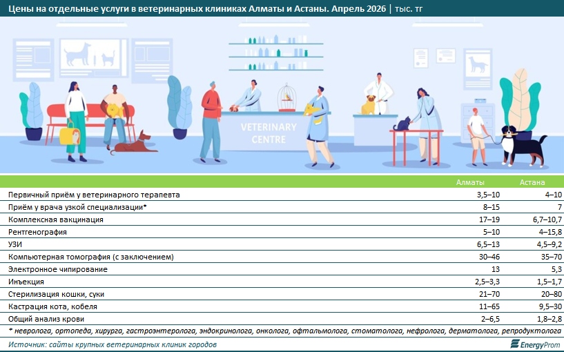 Мы сделали ценовой срез услуг ветеринарных клиник в двух крупнейших городах страны — Алматы и Астане. Оказалось, что стоимость лечения домашних животных близка, а порой и превышает цены на медицинские услуги для людей. Например, первичный приём у врача-терапевта для животных варьируется от 3,5 тыс. до 10 тыс. тг. И это только первая ступень. Если во время осмотра выяснится, что кошке или собаке нужен узкий специалист, хозяевам придётся заплатить за приём у него ещё дополнительно от 7 тыс. тг. У ветеринаров также существует разделение по профилям в зависимости от заболеваний. Ветеринария в Казахстане в последние несколько лет активно развивалась, и теперь в крупных городах готовы предложить свои услуги не только ветеринарные терапевты и хирурги, но и ортопеды, эндокринологи, окулисты и даже репродуктологи. Их услуги оцениваются в 15 тыс. тг за приём.