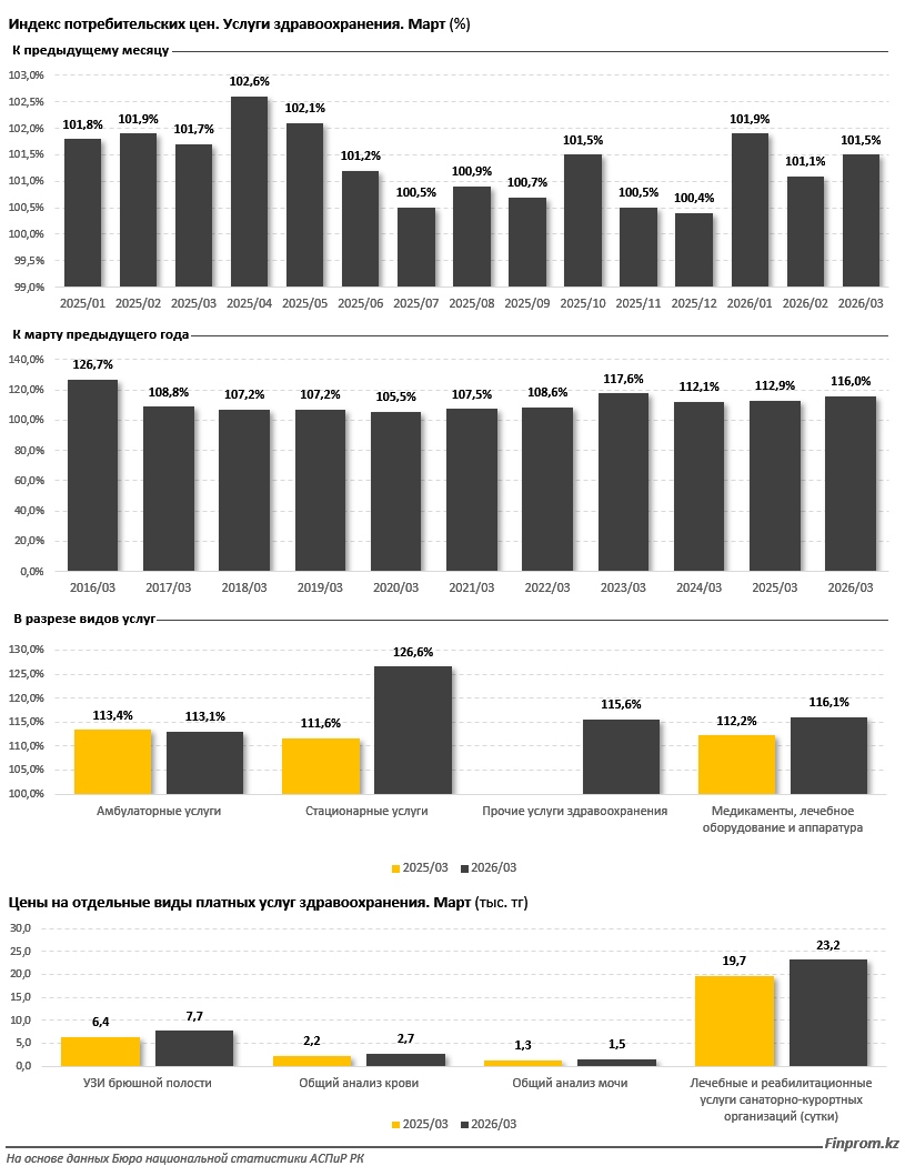Стоимость отдельных обследований также показала рост: УЗИ брюшной полости подорожало до 7,7 тыс. тг, общий анализ крови — до 2,7 тыс. тг, общий анализ мочи — до 1,5 тыс. тг. Стоимость суточного пребывания в санаторно-курортных организациях в марте 2026 года составила 23,2 тыс. тг, против 19,7 тыс. тг годом ранее.