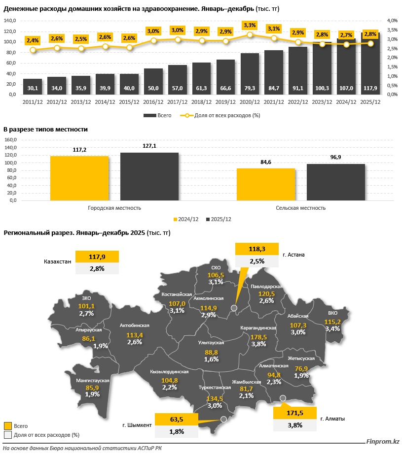 Денежные расходы казахстанских домашних хозяйств на здравоохранение демонстрируют устойчивый долгосрочный рост, однако их относительная нагрузка на бюджет остаётся умеренной. По итогам 2025 года средние расходы на медицину достигли 117,9 тыс. тг на одно домохозяйство, увеличившись на 10,2% за год и почти в 4 раза по сравнению с 2011-м (30,1 тыс. тг). При этом общий объём расходов домохозяйств рос сопоставимыми темпами, что сдерживало увеличение доли: за весь период она колебалась в пределах 2,4%–3,3%, а в 2025 году составила 2,8%. Максимум (3,3%) был зафиксирован в 2020-м, на фоне пандемии и резкого роста затрат на лечение и медикаменты.