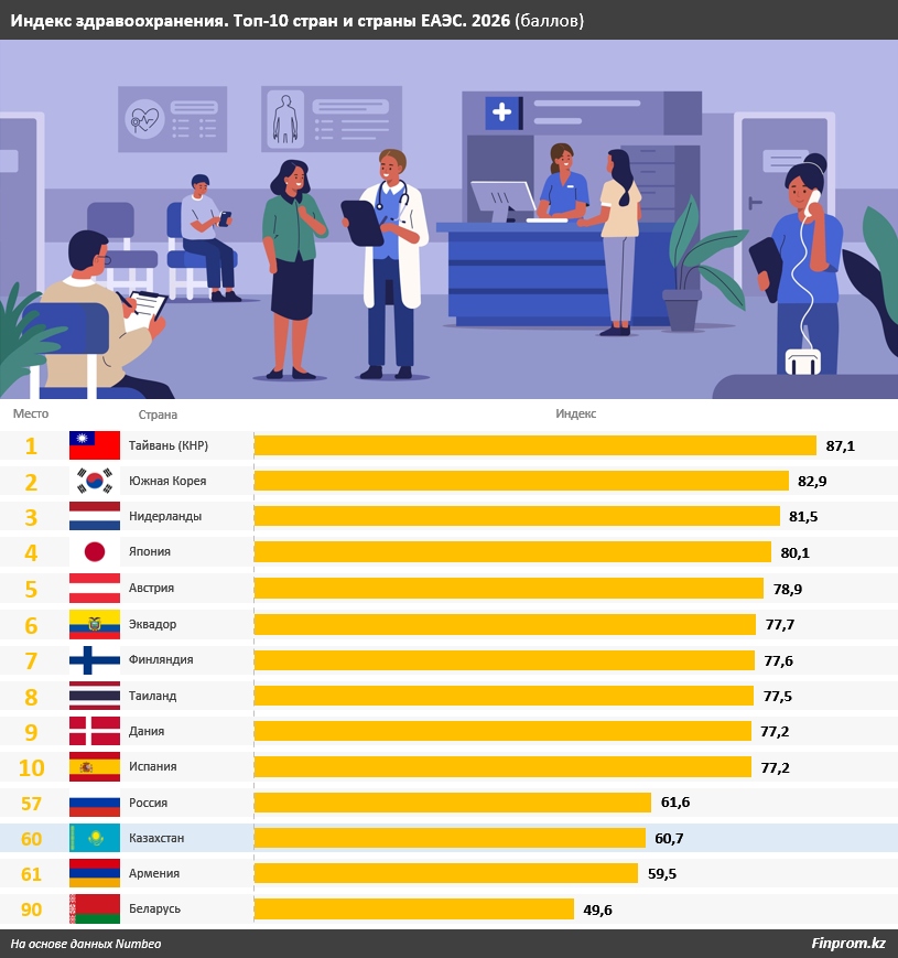 На международном фоне Казахстан занимает средние позиции. В 2026 году, согласно рейтингу Numbeo, страна расположилась на 60-м месте по индексу здравоохранения с результатом 60,7 балла. Это сопоставимо с уровнем России (57-е место и 61,6 балла), но ниже показателей стран-лидеров, таких как Тайвань, Южная Корея и Нидерланды, в которых индекс превышает 80 баллов. Отставание связано с качеством инфраструктуры, доступностью услуг и уровнем обеспеченности медицинскими ресурсами.