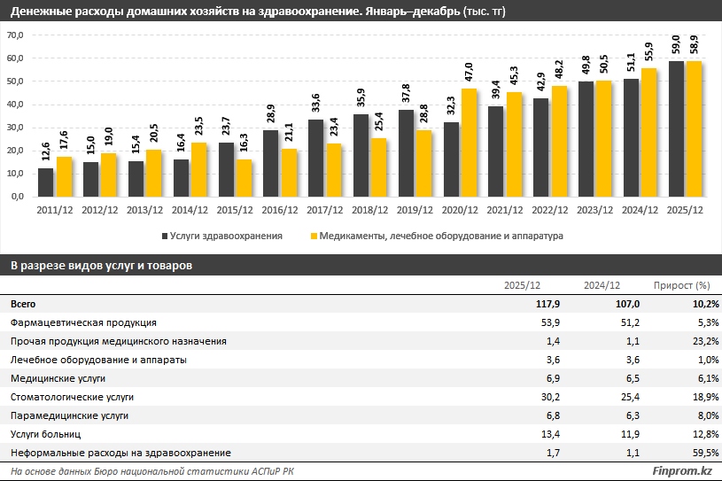 В структуре расходов домохозяйств на здравоохранение впервые за последние шесть лет стали преобладать, хоть и незначительно, траты на услуги: 59 тыс. тг, против 58,9 тыс. тг на лекарства и оборудование. За год расходы на услуги здравоохранения выросли на 15,4%, в то время как траты на фармацевтику и медицинские аппараты — на 5,4%.