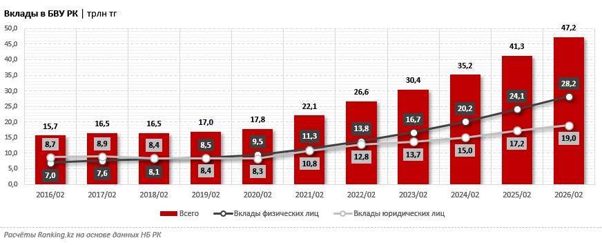 В целом в совокупном портфеле вкладов в БВУ РК на физлиц пришлось уже 28,2 трлн тг, или почти 60%, а на юрлиц — 19 трлн тг, или лишь чуть более 40%. Таким образом, доля депозитов населения в общем объёме вкладов с каждым годом растёт, и тенденция лишь ускоряется.