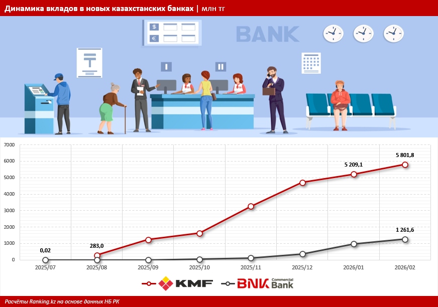 Объём вкладов в KMF Банке на 1 марта текущего года составил 5,8 млрд тг — на 592,8 млн тг больше, чем месяцем ранее, и на 1,1 млрд тг больше, чем в начале года. Напомним: фининститут начал работать в качестве БВУ с прошлого лета, а в августе, когда появилась первая отчётность, портфель вкладов в нём, согласно данным Национального банка РК, составлял 283 млн тг, и с тех пор вырос более чем в 20 раз.