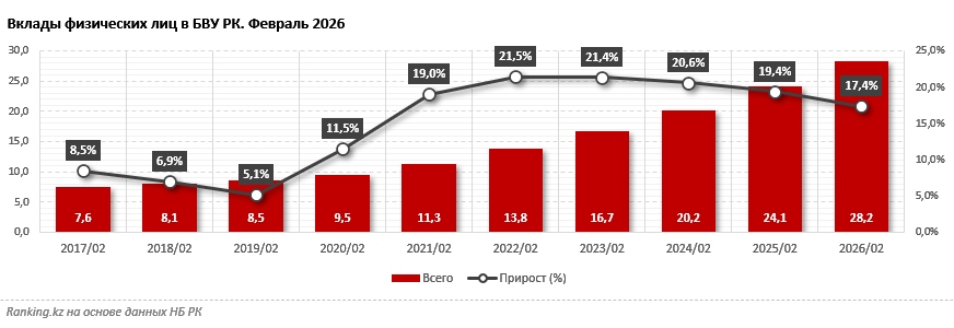 Тем временем официальная статистика по вкладам населения подтверждает рост спроса на депозиты. Так, по состоянию на 1 марта 2026 года вклады физических лиц в БВУ РК превысили 28 трлн тг, увеличившись за год на 17,4%.