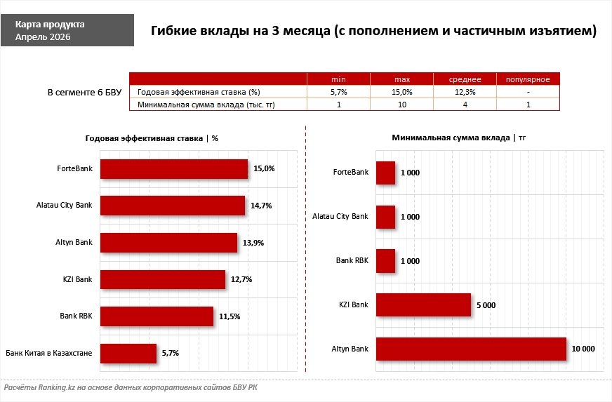 По состоянию на апрель текущего года розничные депозиты с возможностью пополнения и частичного изъятия предлагают 18 из 23 БВУ РК. Среди них открыть гибкий вклад сроком на 3 месяца можно в 6 фининститутах — ForteBank, Alatau City Bank, Altyn Bank, KZI Bank, Bank RBK и Банке Китая в Казахстане.
