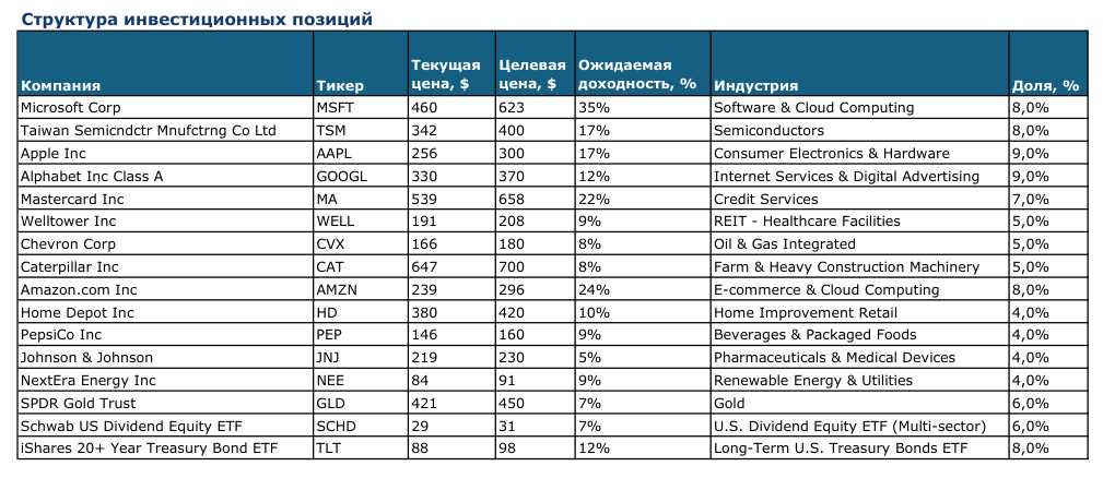 По оценке аналитиков, сбалансированный портфель формируется из диверсифицированного набора акций крупной капитализации и голубых фишек, а также включает долю секторов роста и ETF на облигации.