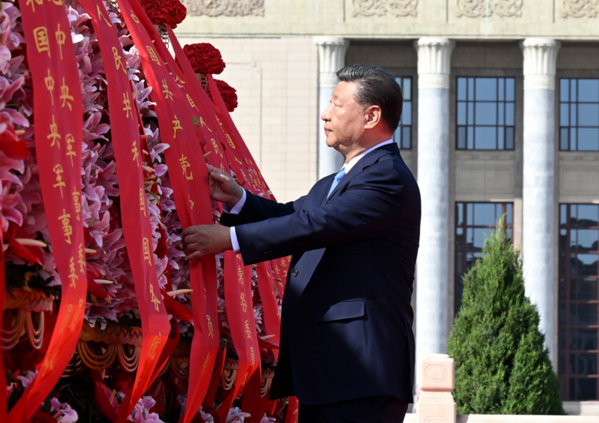 Си Цзиньпин и другие партийные и государственные руководители подошли к основанию памятника, где Си Цзиньпин аккуратно поправил ленточки на корзинах, а затем вместе с другими партийными и государственными руководителями медленно обошел памятник по кругу, смотря на него с почтением.