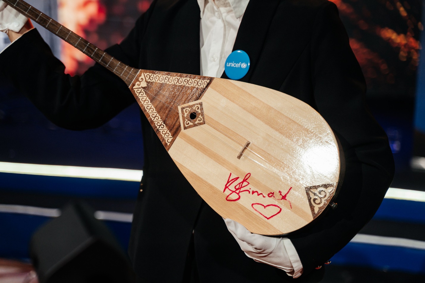 Домбыра Димаша Кудайбергена с личной подписью. Автор фото:@UNICEFKazakhstan/2025/AibekMurati