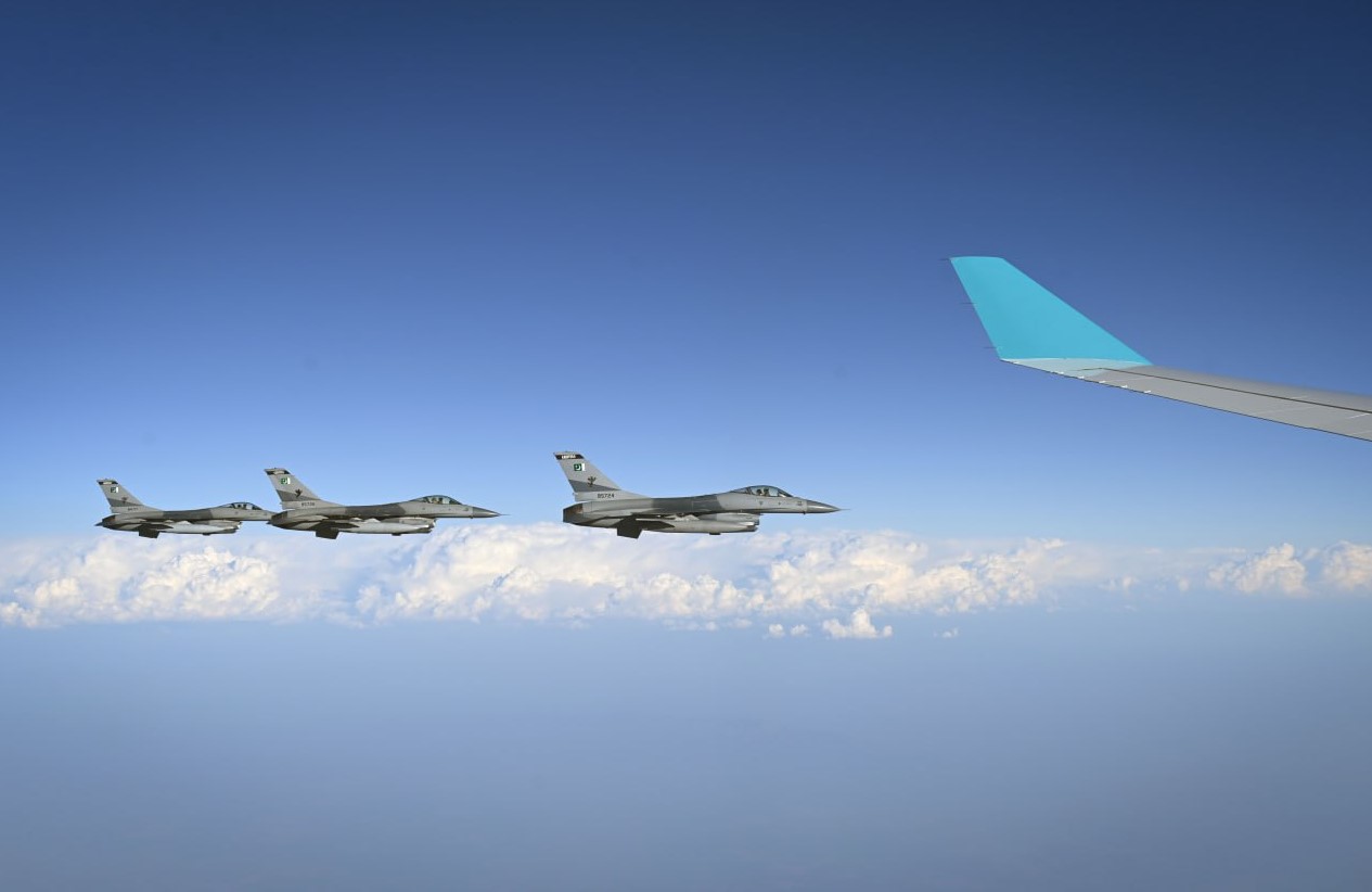 Еще в небе самолет Главы государства сопровождали истребители Военно-воздушных сил Пакистана — жест, который в дипломатическом протоколе символизирует высокий уровень доверия и уважения к зарубежному лидеру.