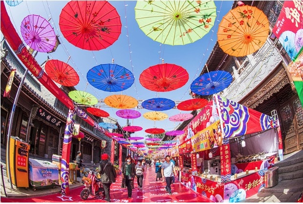 30.09.2020. Туристы прогуливаются под бумажными зонтиками в древнем городе Цинчжоу в провинции Шаньдун на востоке Китая. Фотоматериал «Жэньминь жибао» онлайн/Ван Цзилинь