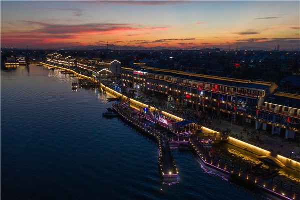 Аэрофотоснимок показывает ночной вид на древний город Танци в районе Юйхан города Ханчжоу в провинции Чжэцзян. 14 августа 2020 года.