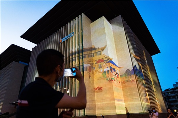 Мужчина фотографирует проекционное шоу на здании Сычуаньской библиотеки в Чэнду, административном центре провинции Сычуань. 29 сентября 2020 года.