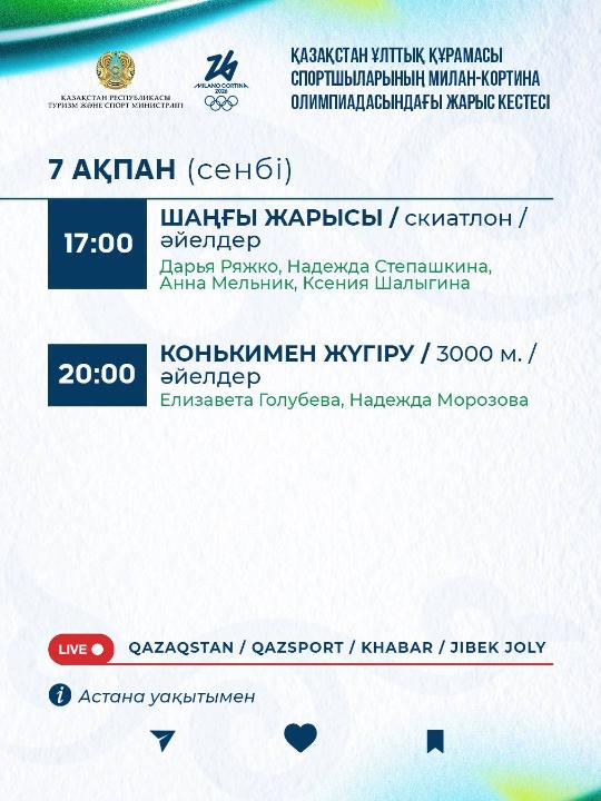 7 февраля официально стартуют Зимние Олимпийские игры Милан–Кортина. В первый соревновательный день на олимпийские трассы и арены выйдут шесть спортсменов из Казахстана, которые выступят в двух видах спорта, передает DKNews.kz.