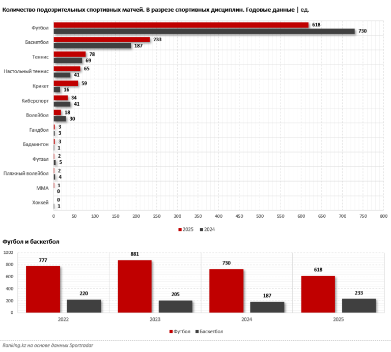 В целом футбол и баскетбол формируют более трёх четвертей всех подозрительных матчей, что объясняется масштабом этих видов спорта, плотностью календаря и высокой вовлечённостью букмекерского сегмента.