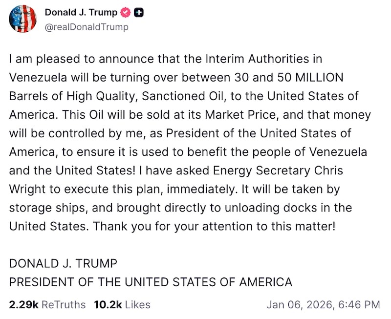 «Временные власти Венесуэлы передадут США от 30 до 50 миллионов баррелей нефти… Деньги от продажи будут контролироваться мной и использованы на благо венесуэльского народа и Соединённых Штатов».
