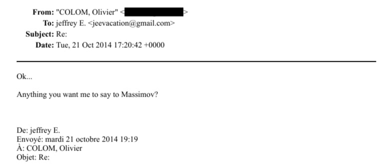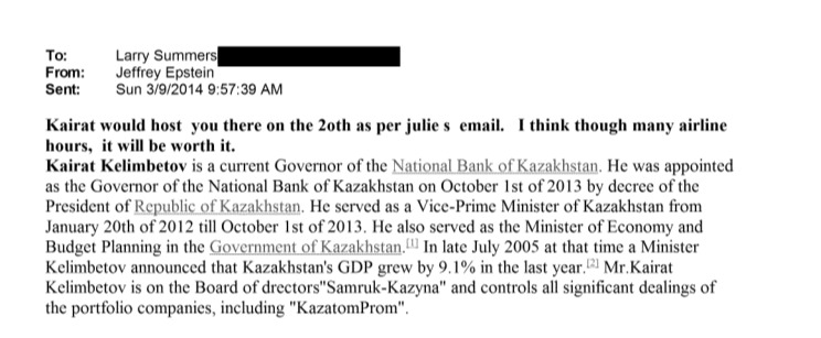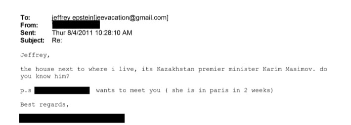 Самое раннее упоминание Карима Масимова датировано 4 августа 2011 года. Оно содержится в одном из писем, адресованных Эпштейну. Автор сообщения пишет, что живёт по соседству с Масимовым, и интересуется, знаком ли адресат с премьер-министром.